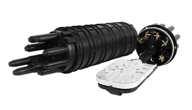 Новая тупиковая оптическая муфта с усовершенствованным трёхточечным байонетным соединением, степенью защиты IP67, шестью вводами Ø16 мм (включая компактный овальный транзитный), съёмной двухсторонней кассетой с подвесными ложементами до 64 сварных соединений и универсальным креплением на опору.