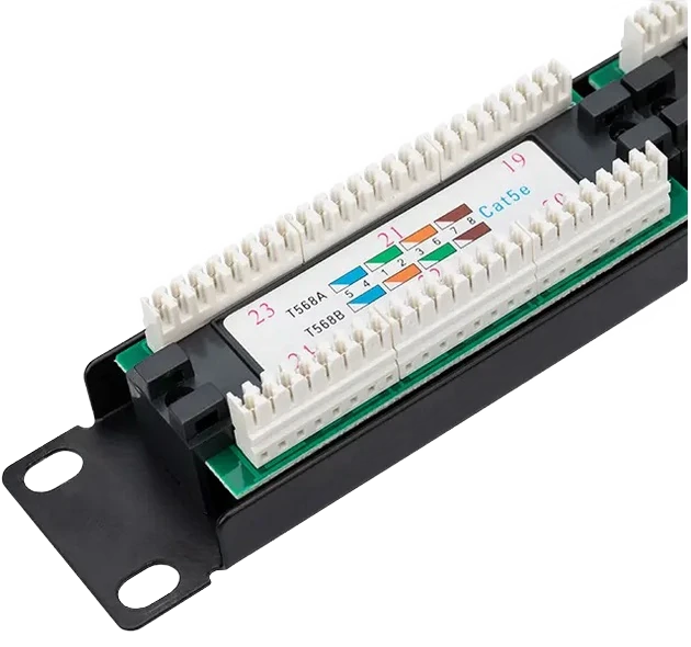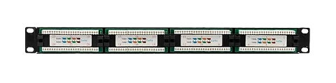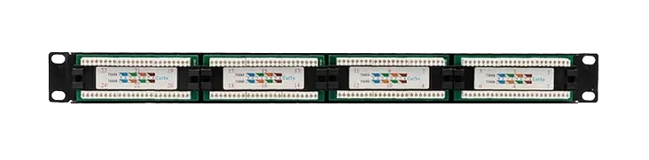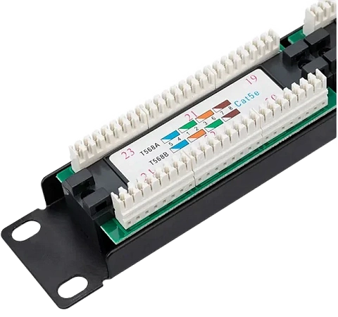Представляет собой панель с множеством соединительных разъёмов – розеток RJ-45, расположенных на лицевой стороне панели и врезными контактами, расположенными на тыльной стороне панели, предназначенными для фиксированного соединения с витопарными кабелями.