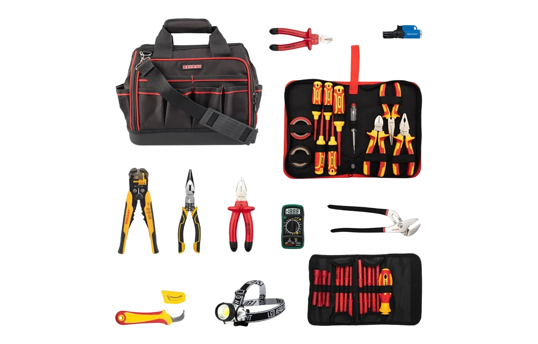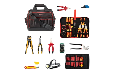 Данный набор состоит из 29 предметов и позволяет провести весь цикл электромонтажа до 1000В. Диэлектрический набор имеет все необходимые инструменты для работы с напряжением до 1000В. В наборе собраны инструменты для зачистки кабеля, обжима клемм и безопасного подключения к щиту, а также диэлектрические отвертки с 14 шлицами, которые подойдут к большинству типов оборудования. Мультиметр, входящий в комплект набора, обладает широким функционалом с функцией DATA HOLD и имеет подсветку. Налобный фонарь позволяет комфортно работать в слабоосвещённых местах. Тестер пробник со сменным наконечником удобен и прост в использовании. Сумка изготовлена из водонепроницаемого материала, что обеспечивает надежную защиту инструментов от воздействия влаги и повышает их долговечность. Набор подходит для профессионального использования.