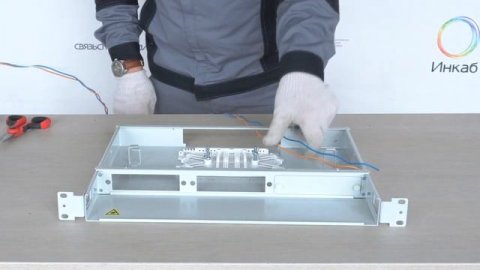Крепление кабеля по оболочке осуществляется металлическим хомутом и/или нейлоновыми стяжками, на специализированном кабельном вводе, который крепиться на задней стенке корпуса. Центральный силовой элемент ОК крепится при помощи металлической скобы. Сменные металлические планки на 8 или 4 отверстий обеспечивают установку адаптеров-розеток различных типов: FC, SC, ST, дуплекс LC. Комплектуется съемной полкой-органайзером.