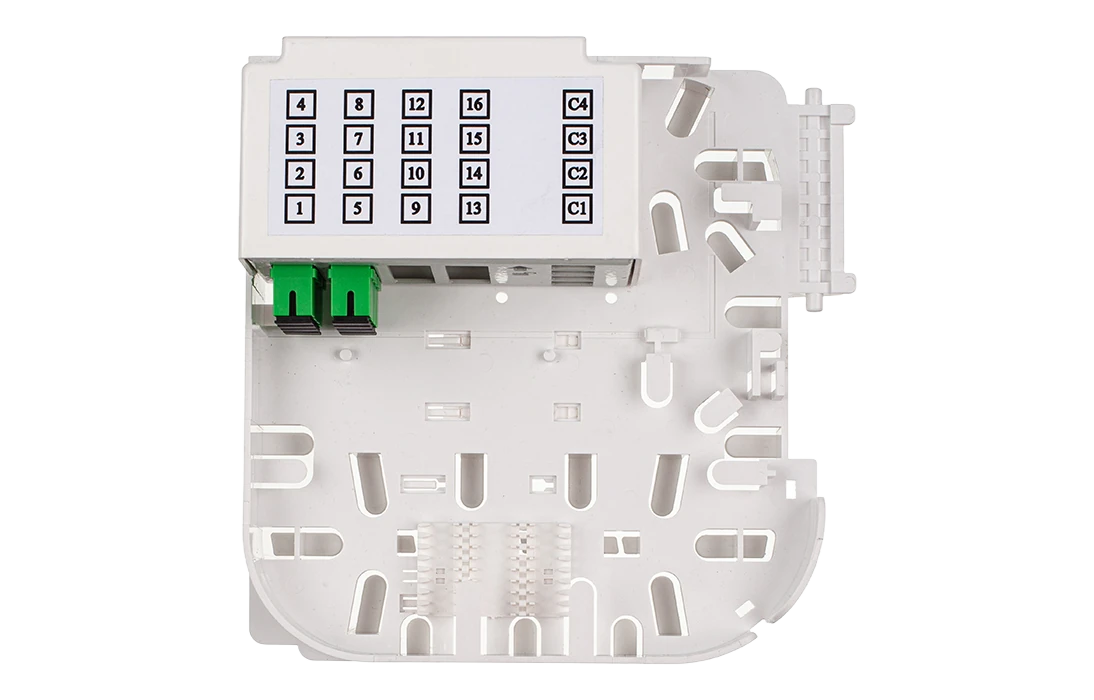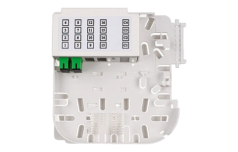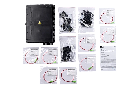 Внутри муфты установлена оригинальная кассета, на внешней стороне которой размещена кроссовая панель или съемный модуль СМ5, в которой можно разместить до 20 адаптеров типа SC, из них 16 предназначены для подключения абонентов и 4 для подключения разветвителей в мини корпусе (4 шт. 1х4 или 2 шт. 1х8, или 1 шт. 1х16).  Выводы разветвителей и пигтейлы защищаются от повреждений корпусом модуля СМ5. Перед кроссовой панелью установлен ложемент для сварки пигтейлов и неоконцованных абонентских дроп- кабелей. На обратной стороне кассеты могут быть размещены ложементы для установки разветвителей и ложементы для 48 гильз ССД КДЗС 4525,  а также поле для размещения запаса ОВ и выводов разветвителей.