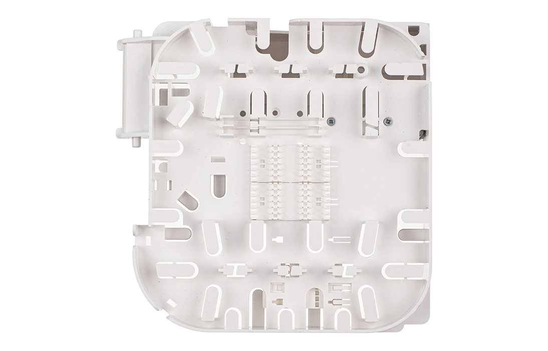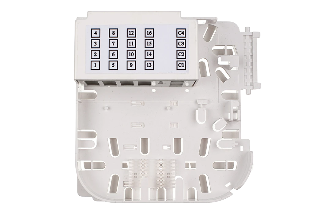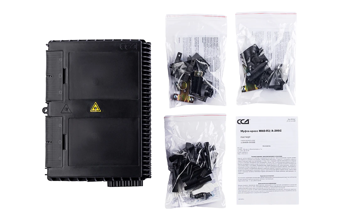 Внутри муфты установлена оригинальная кассета, на внешней стороне которой размещена кроссовая панель или съемный модуль СМ5, в которой можно разместить до 20 адаптеров типа SC, из них 16 предназначены для подключения абонентов и 4 для подключения разветвителей в мини корпусе (4 шт. 1х4 или 2 шт. 1х8, или 1 шт. 1х16).  Выводы разветвителей и пигтейлы защищаются от повреждений корпусом модуля СМ5. Перед кроссовой панелью установлен ложемент для сварки пигтейлов и неоконцованных абонентских дроп- кабелей. На обратной стороне кассеты могут быть размещены ложементы для установки разветвителей и ложементы для 48 гильз ССД КДЗС 4525,  а также поле для размещения запаса ОВ и выводов разветвителей.