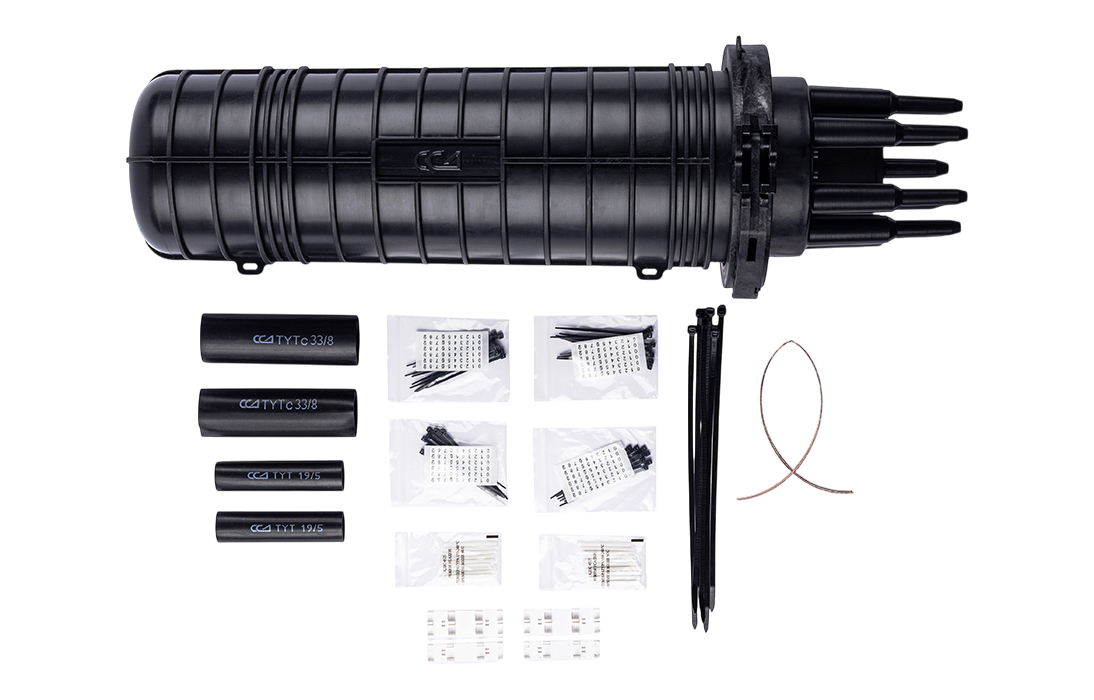 Способ герметизации вводов кабелей, осуществляется с помощью термоусаживаемых трубок ТУТ. Круглые патрубки на оголовнике муфты изначально герметичны и имеют ступенчатую форму с разными диаметрами. Срезая патрубок в определенном месте можно подобрать отверстие максимально близкое к диаметру вводимого кабеля. Таким образом, исключается излишнее натяжение ТУТ после усадки при вводе относительно тонких кабелей. Все патрубки муфты оснащены также индивидуальными узлами крепления ЦСЭ.