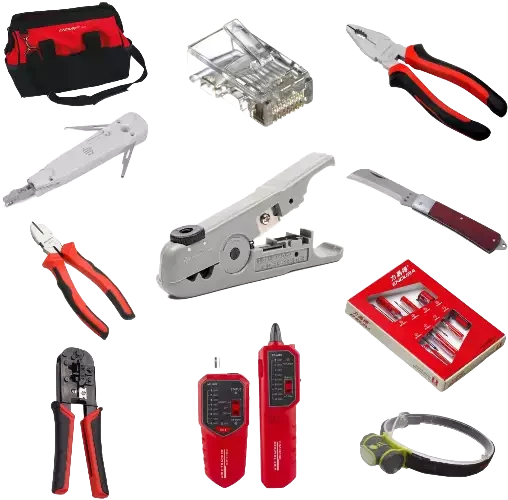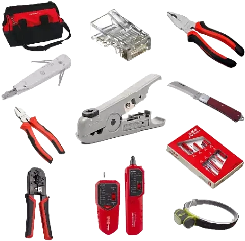 Данный набор инструментов предназначен для монтажа и обслуживания Ethernet сетей, телефонии, кабельного телевидения и других систем передачи данных. Он содержит профессиональный инструмент для резки и разделки витой пары, телефонного и коаксиального кабеля. Набор позволяет устанавливать модульные разъемы RJ45, RJ11/12, RJ22, проверять правильность обжима коннектора, целостность линии, идентифицировать нужный кабель из пучка, находить порты коммутатора и розетки пользователя.