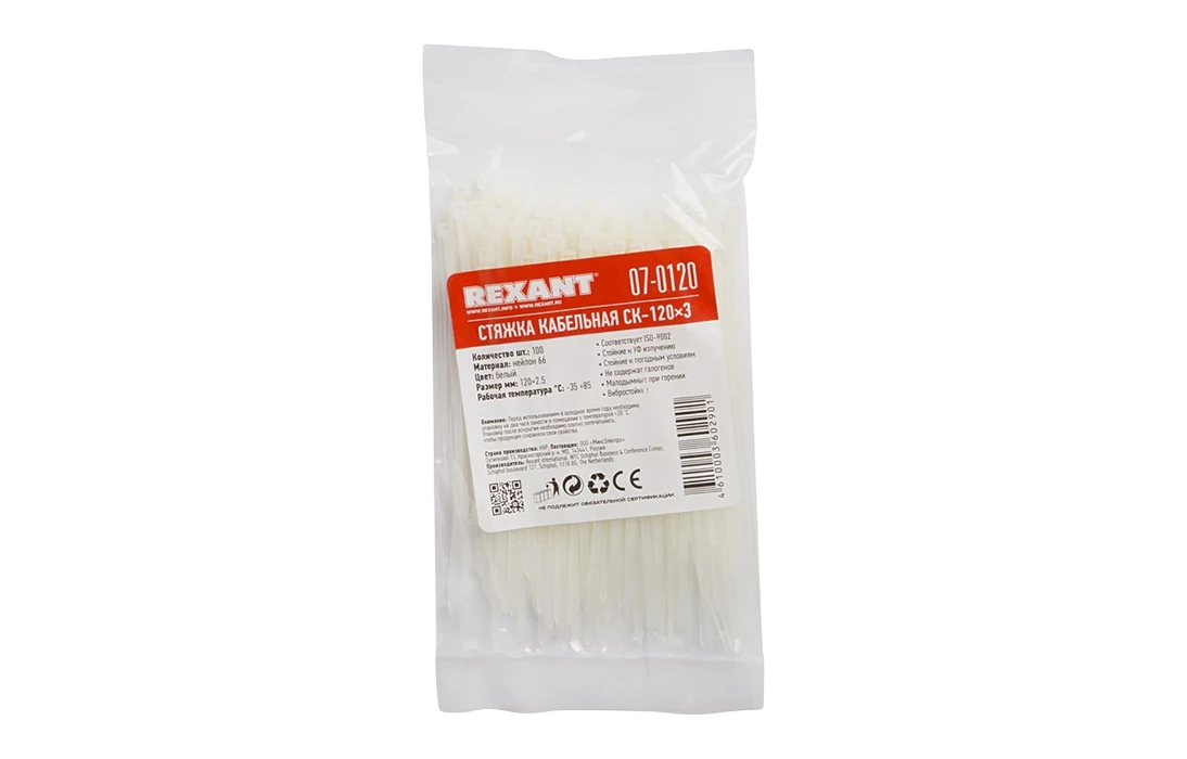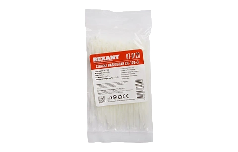 07-0120 Хомут-стяжка кабельная нейлоновая REXANT 120 x2,5 мм, белая, упаковка 100 шт.