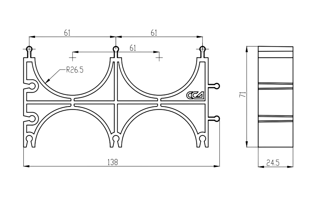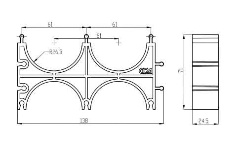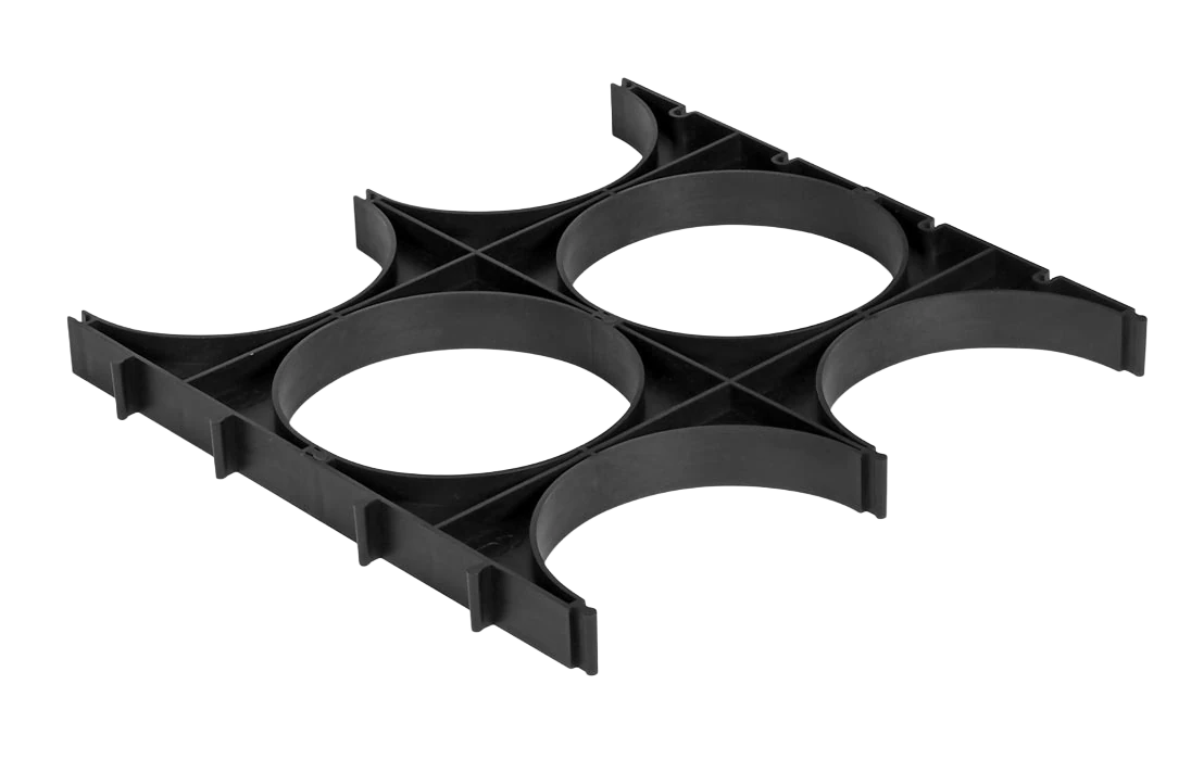 Кластер представляет собой решетчатое изделие с ложементами для укладки труб, выполненное из пластика. На корпусе кластера имеются специальные выступы и пазы для соединения нескольких кластеров в единый блок при прокладке большего количества каналов.