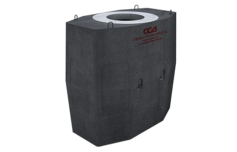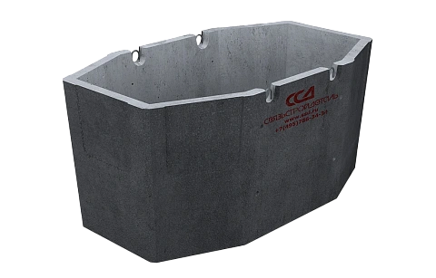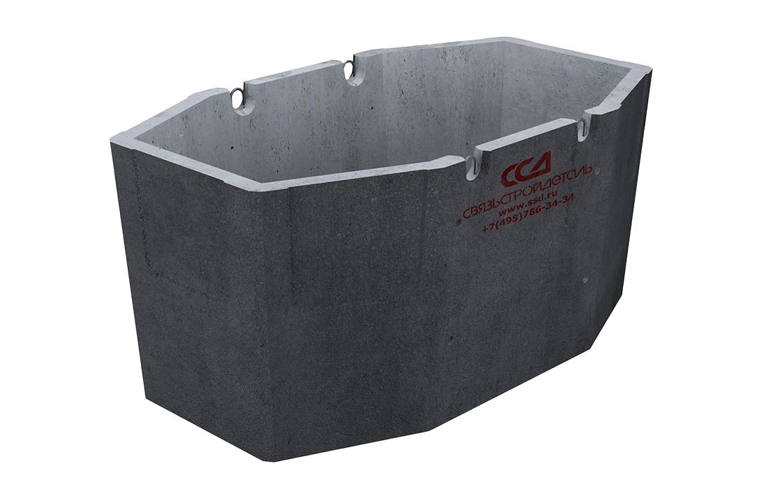 Колодец имеет в сечении восьмиугольную форму и состоит из двух элементов – верхней и нижней половин. Перекрытие верхнего элемента дополнительно армировано и содержит круглое отверстие диаметром 600 мм для формирования горловины с люком. В основании нижней половины колодца с внутренней стороны расположена прямоугольная ниша. При необходимости, ее стенку вырезают для создания дренажа. На наружных поверхностях торцевых и боковых стен расположены ниши, в пределах которых можно проделывать отверстия для ввода каналов. В виду того, что стенки в нишах не имеют отверстий, это позволяет в местах строительства кабельных колодцев проделывать (высверливать) отверстия в тех местах, в которых к колодцу подходят трубы.