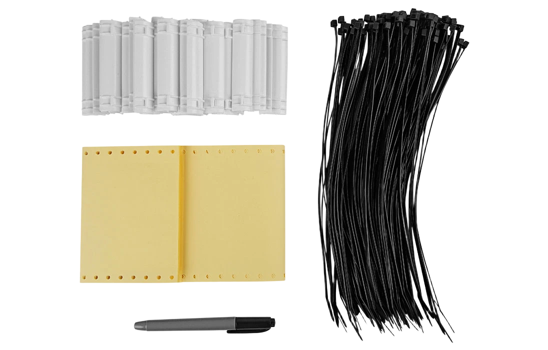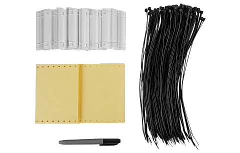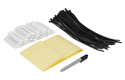 Поставляется наборами, состоящими из 50 пластмассовых бирок с проушинами, 50 самоламинирующихся маркеров для надписей, 100 пластмассовых стяжек длинной 250 мм и маркер-ручки перманентной для нанесения надписей.