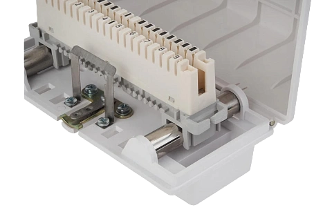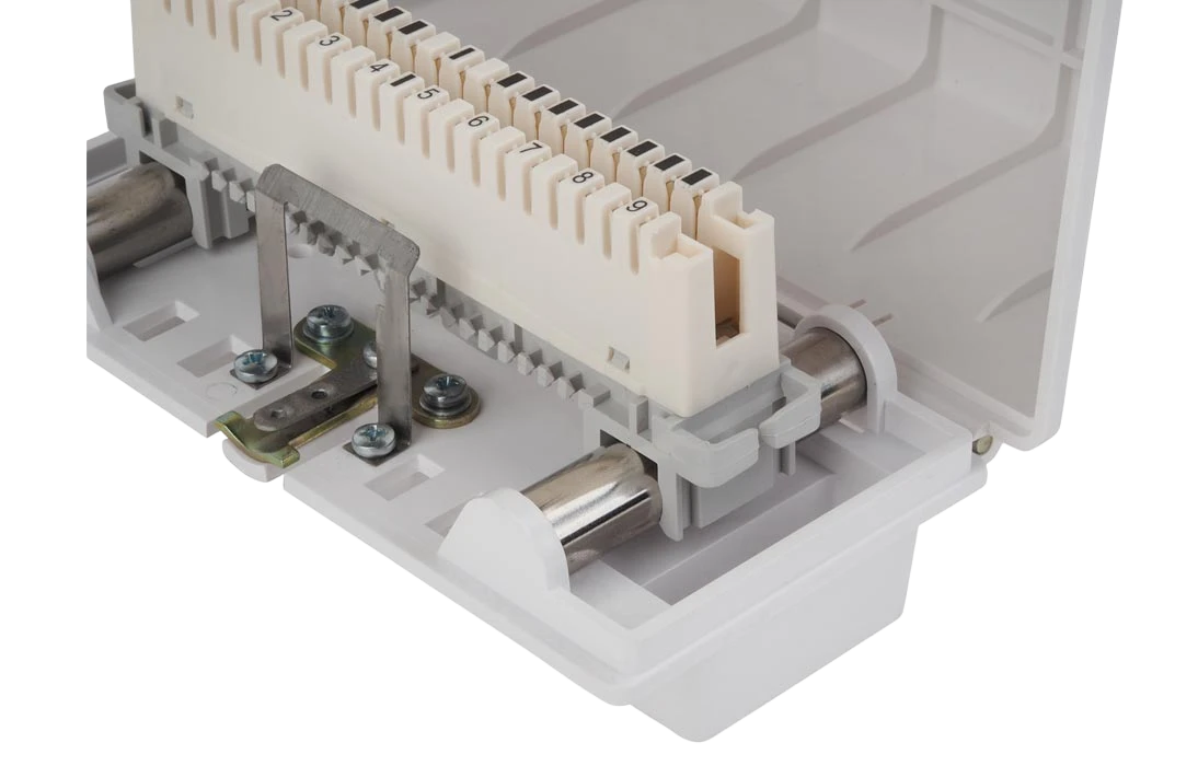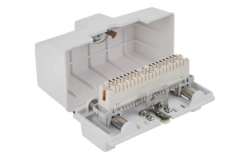 Конструкция узла крепления кабелей в коробках при необходимости обеспечивает надежный электрический контакт с экраном входящего распределительного кабеля, что облегчает его заземление. Ввод кабелей осуществляется через вырез в крышке, что упрощает монтаж и позволяет использовать для абонентской разводки не только провода ТРП/ТРВ, но и четырехпарные кабели типа UTP/FTP.