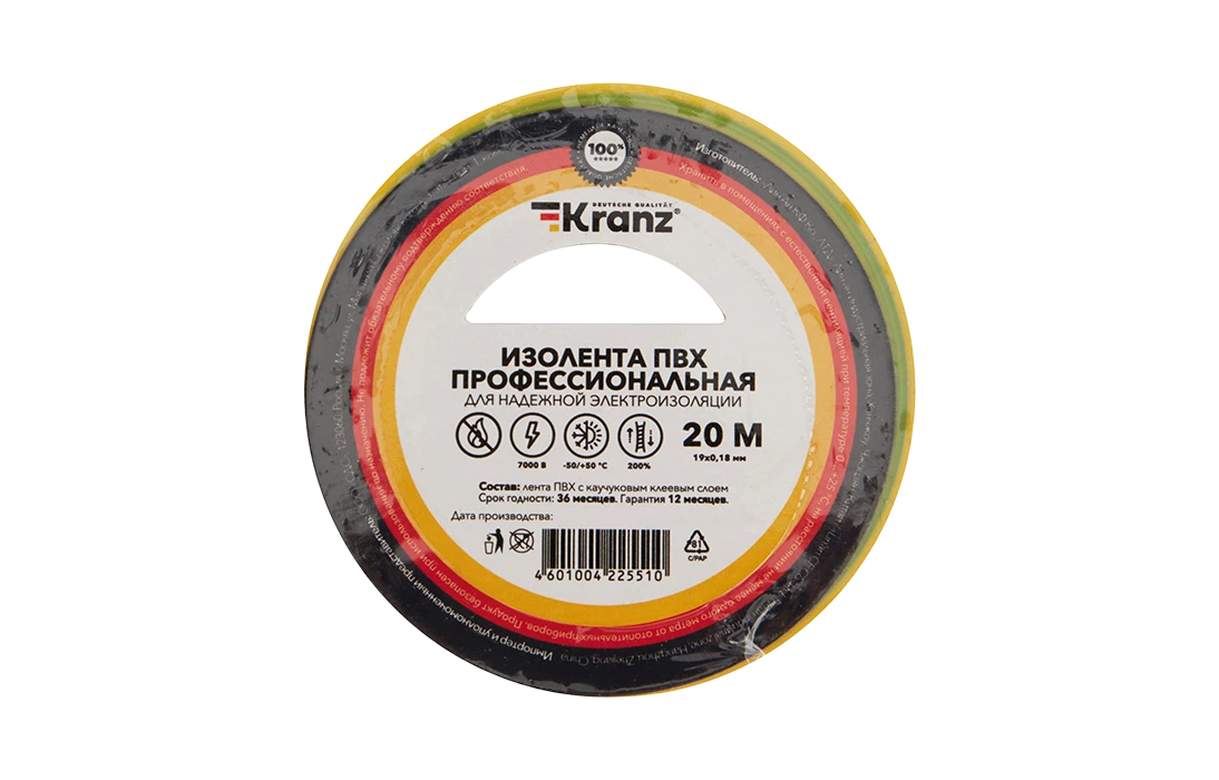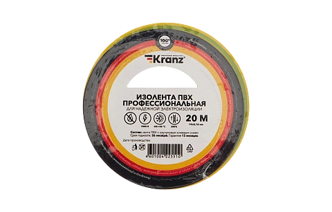 Профессиональная изоляционная лента KRANZ класса PREMIUM используется для электрической изоляции, цветной маркировки, соединения, защиты от внешних факторов и герметизации кабелей, проводов и шнуров.