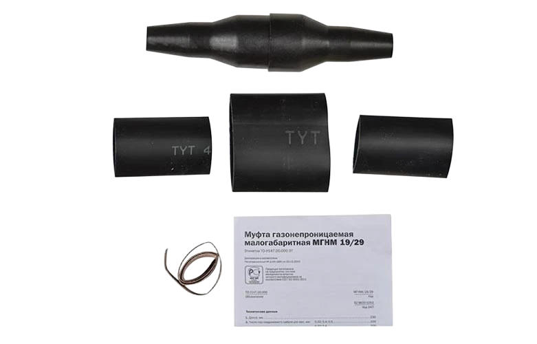 Муфты представляют собой комплекты состоящие из деталей корпуса и термоусаживаемых трубок используемых для герметизации муфты. Муфты в процессе монтажа заливаются саморасширяющимся полиуретановым герметиком «Вилад-31», состоящим из двух компонентов, А и Б (приобретается отдельно).