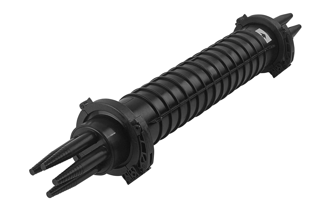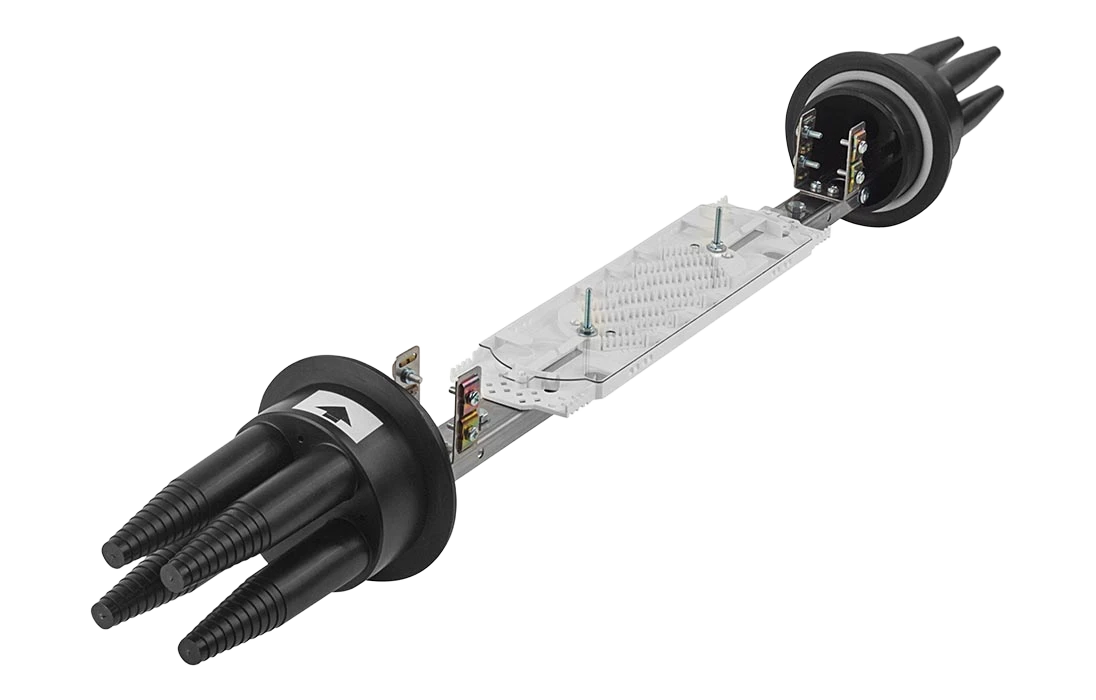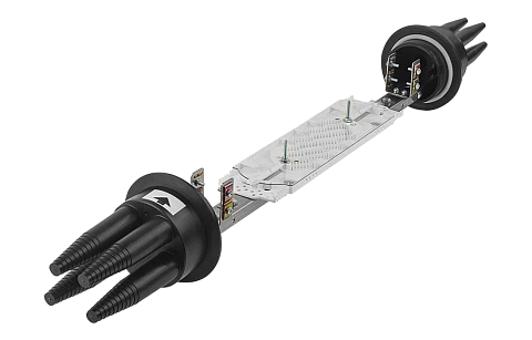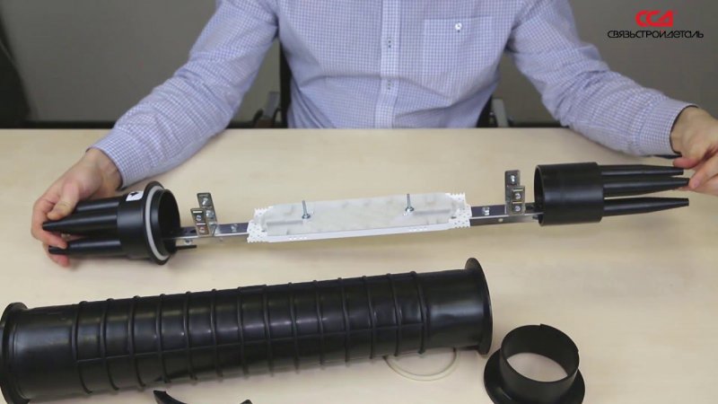 Способ герметизации вводов кабелей, осуществляется с помощью термоусаживаемых трубок ТУТ. Круглые патрубки на оголовнике муфты изначально герметичны и имеют ступенчатую форму с разными диаметрами. Срезая патрубок в определенном месте можно подобрать отверстие максимально близкое к диаметру вводимого кабеля. Таким образом, исключается излишнее натяжение ТУТ после усадки при вводе относительно тонких кабелей. На лотке муфты установлены узлы для крепления ЦСЭ вводимых кабелей.
