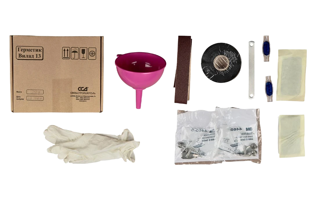 Сростки жил в муфте заливаются герметиком «Вилад-13». Для этого в корпусе муфты МПП 0,1/0,3 сделаны два отверстия и в состав комплекта включены две пробки. Отвердевший герметик представляет собой монолит, поэтому залитые им муфты не демонтируются.