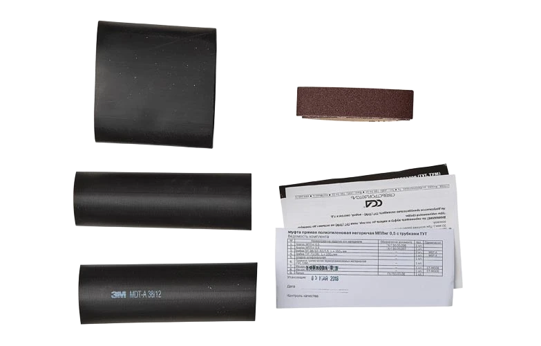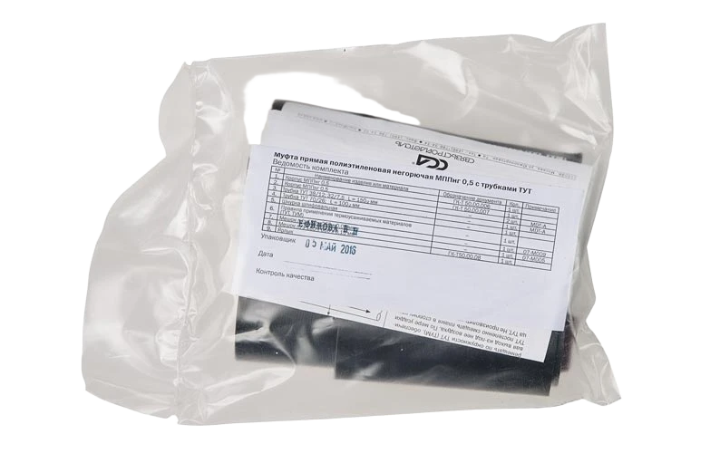 В комплект входят корпус муфты и отрезки трубок ТУТ не распространяющих горение, подобранные с учётом диаметров частей муфты и диаметров оболочек сращиваемых кабелей. Комплект позволяет выполнить только одну монтажную операцию – герметизацию муфты. Для выполнения остальных монтажных операций, таких как сращивание жил, восстановление экрана, восстановление поясной изоляции, следует дополнительно приобретать расходные материалы.