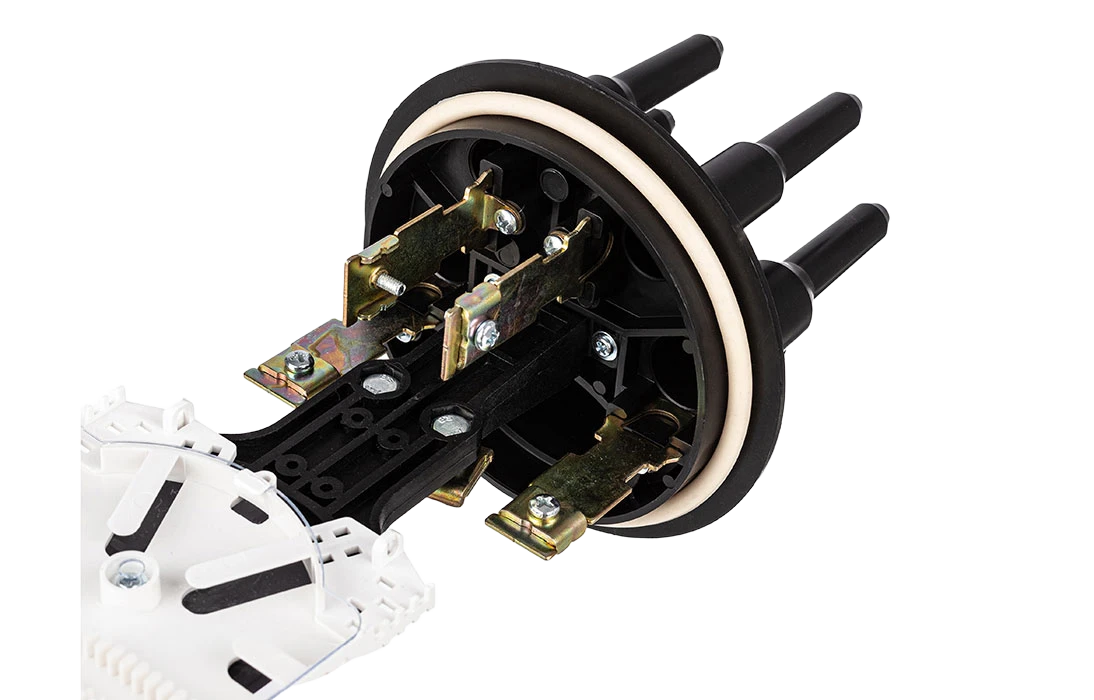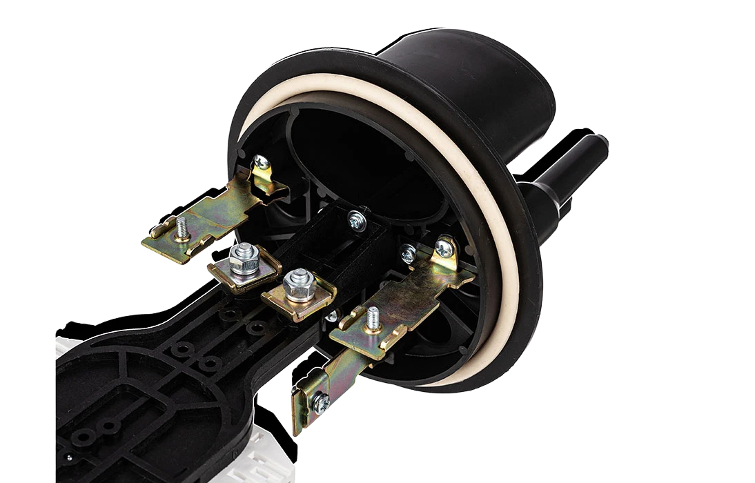 Способ герметизации вводов кабелей, осуществляется с помощью термоусаживаемых трубок ТУТ. Круглые патрубки на оголовнике муфты изначально герметичны и имеют ступенчатую форму с разными диаметрами. Срезая патрубок в определенном месте можно подобрать отверстие максимально близкое к диаметру вводимого кабеля. Таким образом, исключается излишнее натяжение ТУТ после усадки при вводе относительно тонких кабелей. Все патрубки муфты оснащены также индивидуальными узлами крепления ЦСЭ.