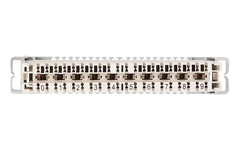 Имеет 10 пар гнезд. Соединение кабелей осуществляется с внешней стороны плинта при помощи специальных однопарных вилок, с внутренней стороны происходит распределение телефонных пар по номерам абонентов.