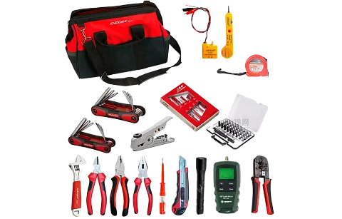 SK-LAN-2 - набор инструментов предназначен для монтажа и обслуживания Ethernet сетей, телефонии, кабельного телевидения и других систем передачи данных. Он содержит профессиональный инструмент для резки и разделки витой пары, телефонного и коаксиального кабеля. Набор позволяет устанавливать модульные разъемы RJ45, RJ11/12, RJ22, проверять правильность обжима коннектора, целостность линии, идентифицировать нужный кабель из пучка, находить порты коммутатора и розетки пользователя. Кроме того, набор включает инструмент для сборки и разборки различных конструкций и офисного оборудования.